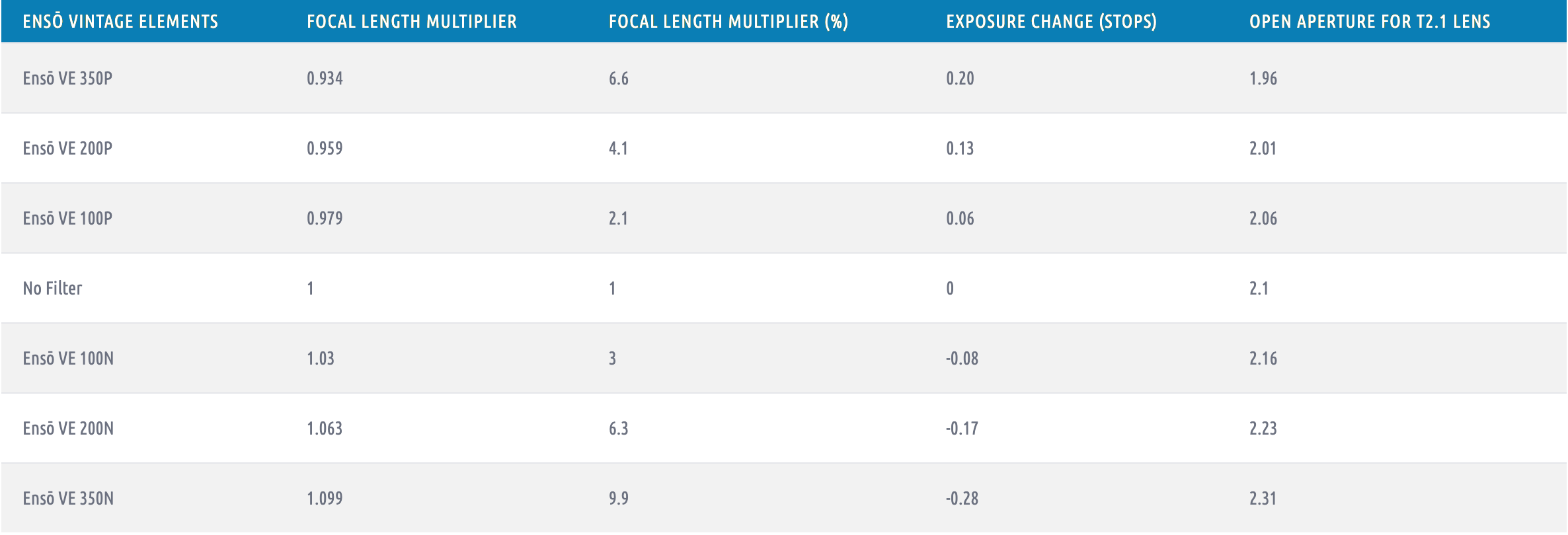 I’ve added a chart below but for example a 24mm T2.1 with a 100P filter becomes a 23.2mm T2.0 lens. I haven’t found this to be a problem or even something I am consciously thinking about on set but it’s good to have in the back of your mind.